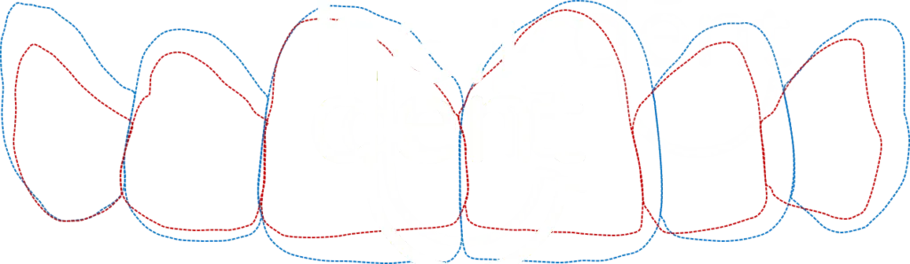 Durante la evaluación de la paciente, se observó que al sonreír frontalmente, sus dientes antero-superiores presentaban un importante desgaste, provocando una sonrisa recta o incluso invertida. Este deterioro dental generaba desarmonía en su apariencia y contribuía a la percepción de una sonrisa envejecida. Además, se identificó una leve inclinación del plano incisal en comparación con las líneas horizontales de referencia. No obstante, se pudo constatar que la cantidad y disposición del tejido blando era simétrica y armónica, lo que favorecía un buen resultado predecible al término del proceso de rehabilitación.