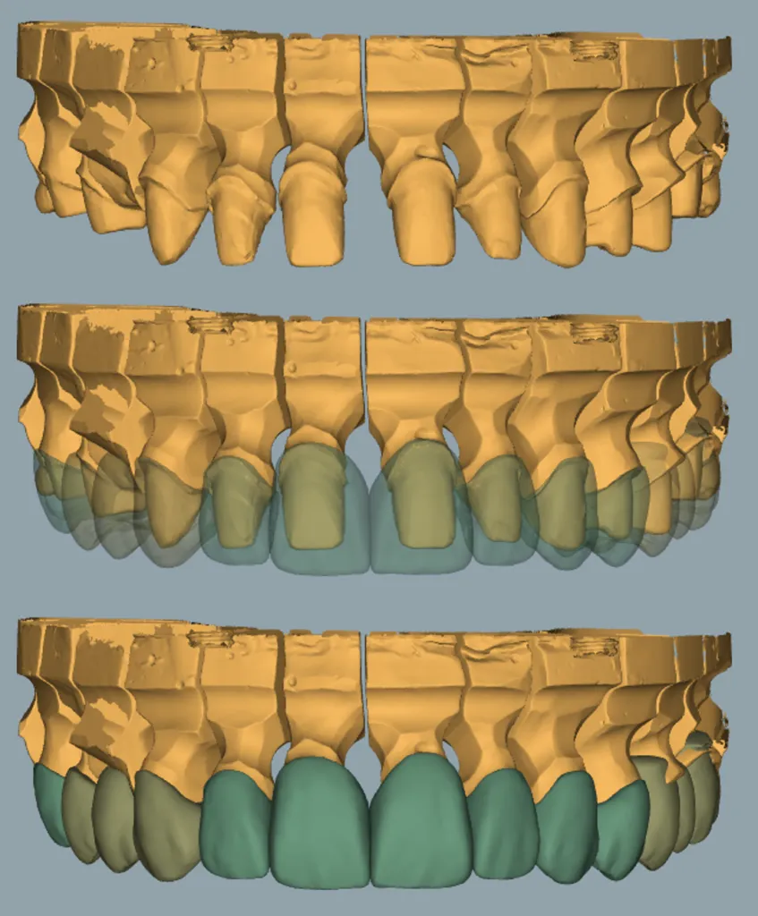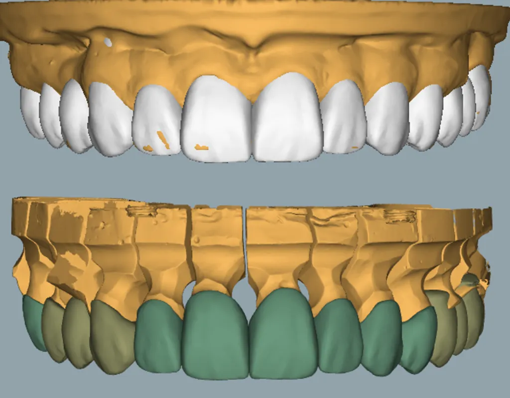 Recientemente, recibí a un paciente que requería la rehabilitación de varias coronas en el maxilar superior, realizamos un diagnóstico exhaustivo utilizando herramientas digitales, tales como imágenes radiográficas y modelos digitales, para planificar la preparación y forma de las coronas de circonio.
