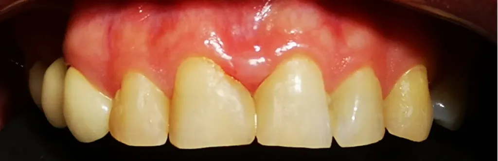 Se observa en el análisis intraoral que los cénits gingivales no se encuentran en su posición adecuada, lo que causa una alteración en la inclinación visual de los dientes debido a las parábolas gingivales mal posicionadas. Para solucionar este problema, se ha planificado una remodelación gingival que permitirá corregir la posición de los cénits y, en consecuencia, mejorar la apariencia de las parábolas gingivales.